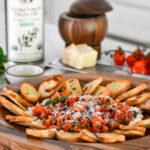 This is the kind of appetizer that feels effortless but looks like you planned ahead. Juicy cherry tomatoes, fresh basil, minced garlic, and a touch of Calabrian chili come together in a way that’s classic, with just enough heat to keep things interesting. Everything is finished with good olive oil and a drizzle of balsamic glaze for that perfect sweet-and-savory balance.
