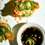 To assemble, place the crispy rice cakes on a plate, layer with avocado, cucumbers and sliced jalapeños. Drizzle some spicy mayo and enjoy!
